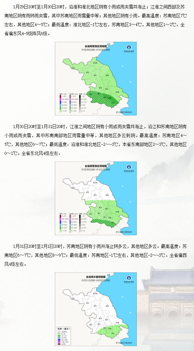 针对南京地区,气象部门特别提示,1月29日夜里至30日白天该市将有小到中雨,30日夜里至31日早晨迎来雨夹雪或雪,雨雪量小到中等,南部地区可达中雪,最大积雪深度2~3厘米,其他地区约1厘米左右;48小时最低气温下降3~5℃,2月1日早晨最低气温将降至-1~-2℃,1月31日白天阴有小雨或小雨夹雪,夜里雨雪逐渐停止。