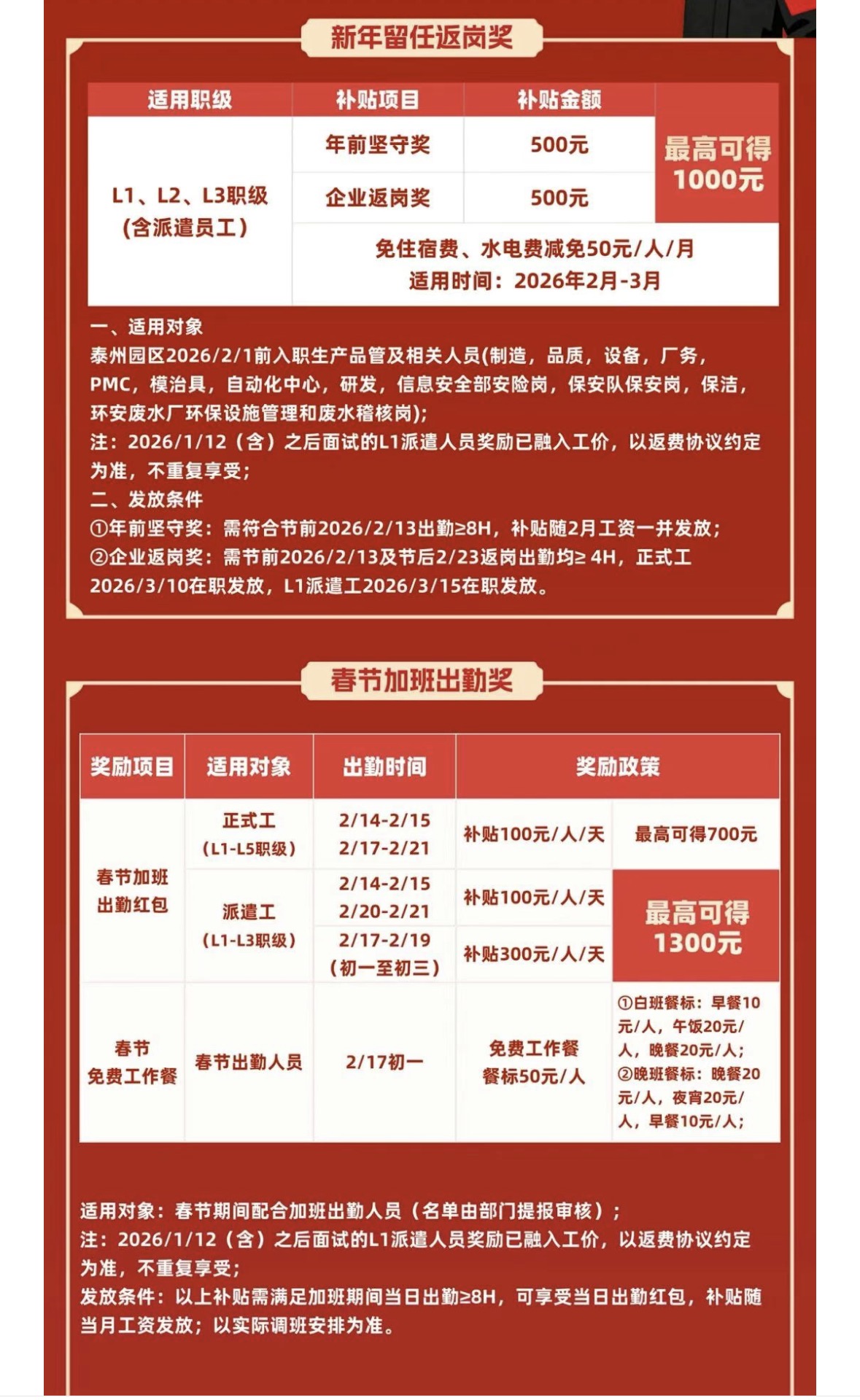 记者发现,很多用工大户采取各种薪酬激励方式鼓励员工留苏过年,如蓝思精密(泰州)有限公司1月26日打出“新春坚守有回响!在岗奖金最高2600元”的留任返岗奖励;宁德时代及其独资分公司对在2月9日至2月28日在岗职工每天额外补贴200元。