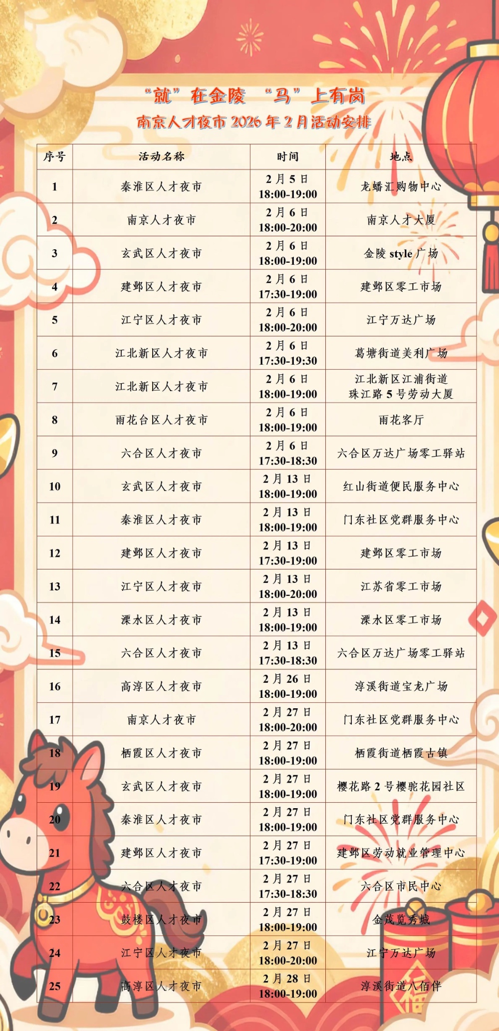 招聘服务更是“不打烊”、不停歇。线下,南通市一季度将举办230场以上招聘活动,提供就业岗位8万多个。连云港依托“家门口”就业服务站、“港城快工”零工市场等渠道,全方位采集2万多个生产性岗位需求和生活性零工岗位,方便留港人员春节期间求职。遍地开花的“人才夜市”让传统的招聘会融入了浓浓的“烟火气”,常州打造“常夜聘·职有光”品牌,将招聘会开进商圈,开到乡镇;泰州计划在各类“夜消费”主题现场组织160场夜市招聘,让“逛街”与“选岗”无缝衔接。南京、徐州等地广泛运用“苏心聘”等平台实现线上智能匹配、线下精准对接。