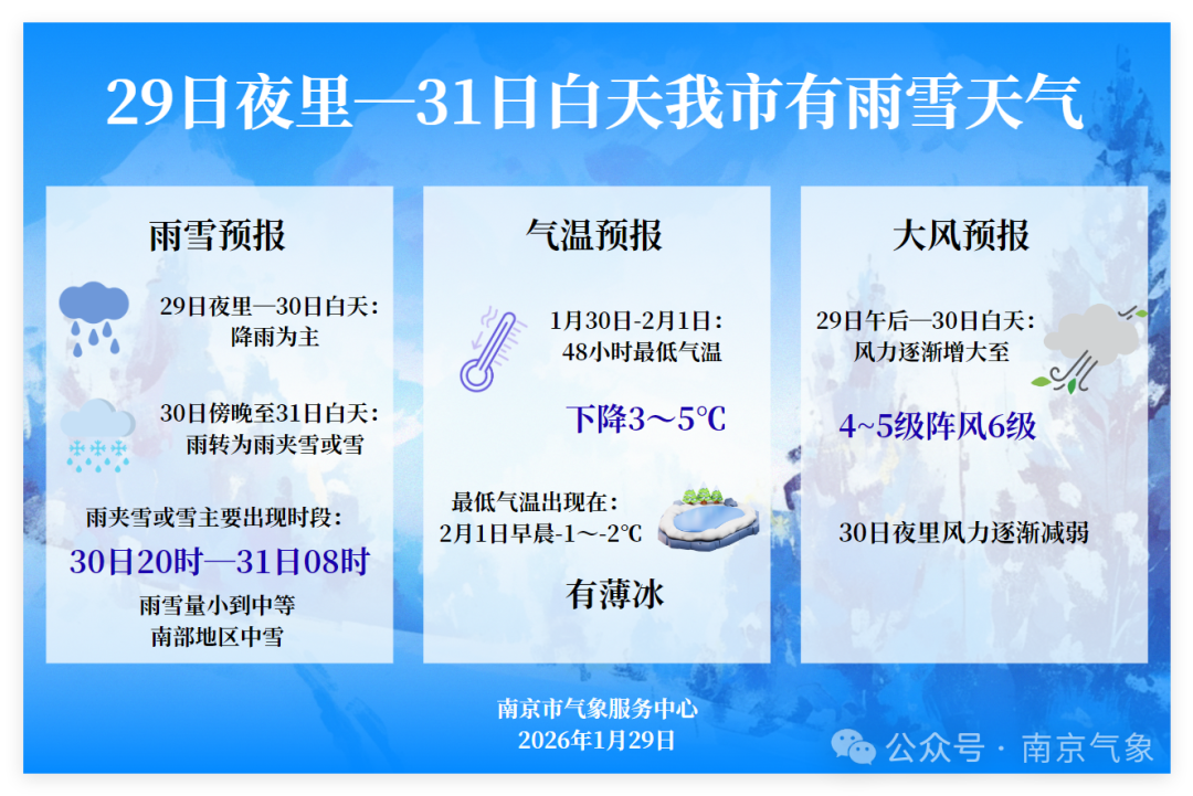 冷空气+雨雪即将“到货”!1月29日夜里至31日白天,南京有一次雨雪天气过程。此次过程雨雪相态复杂、降温明显、风力较大,主要雨雪过程出现在周五夜里至周六早晨,周六白天雨雪减弱。今天,南京市教育局为师生家长准备了一份雨雪天安全“温馨提示”。提示中提及:如遇极端天气或交通受阻等特殊情况,学生到校时间可适当延后,学校不作迟到处理。