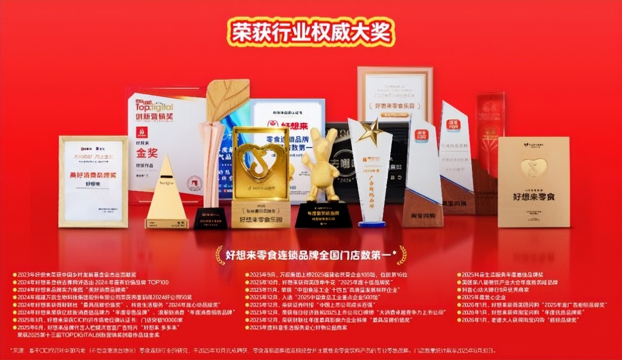 另有数据显示,2025年12月6日至2026年1月4日期间,好想来通过即时零售平台实现的外卖业务实收额突破1亿元人民币,位列量贩零食行业单量榜首。品牌也接连获得美团闪购、淘宝闪购等合作伙伴的高度认可,并获得“2025年度广告新锐品牌”“年度优质品牌”等年度荣誉,确立了在即时零售赛道的领跑者地位。