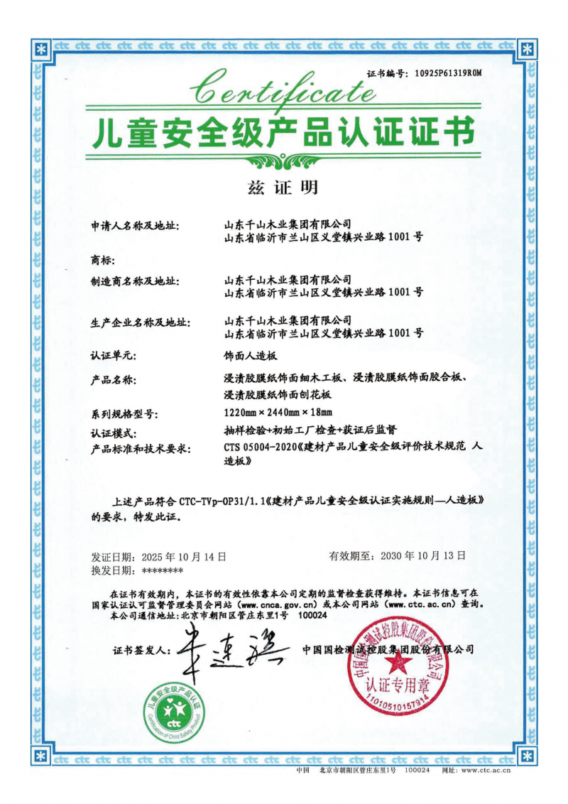 儿童安全级产品认证是当前国内针对儿童用品及儿童活动空间相关材料的顶级安全认证之一。儿童的呼吸系统更为脆弱,免疫系统尚未完善,对甲醛等有害物质的抵抗能力更弱,因此认证流程复杂繁琐,检测项目全面细致,标准更是严苛到极致,目的就是筛选出真正对儿童无害、具备高度安全性的优质产品。而千山板材以优于国家标准的环保性能,成功通过了这项严苛的评估。
