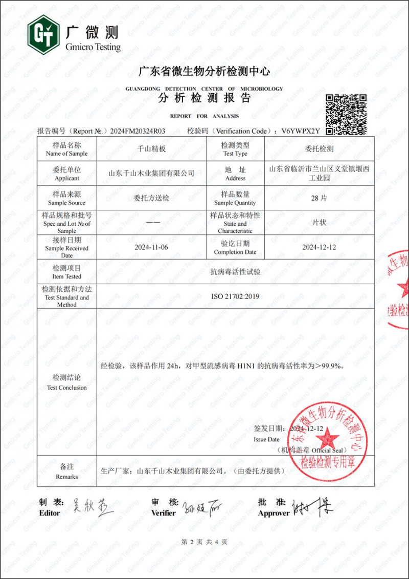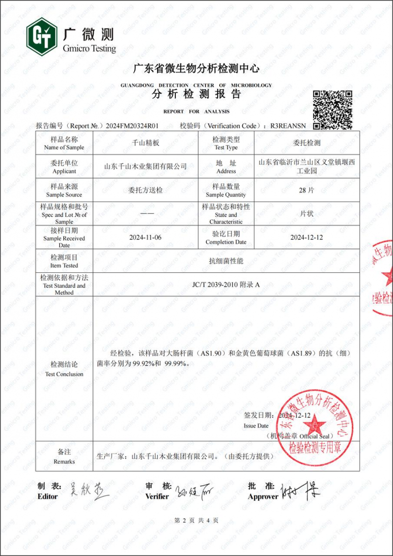 3.抗菌抗病毒:板材对大肠杆菌、金黄色葡萄球菌的抗菌率超过99.9%,对甲型流感病毒H1N1的抗病毒活性率也>99.9%,为家人构筑起一道生物防护屏障。