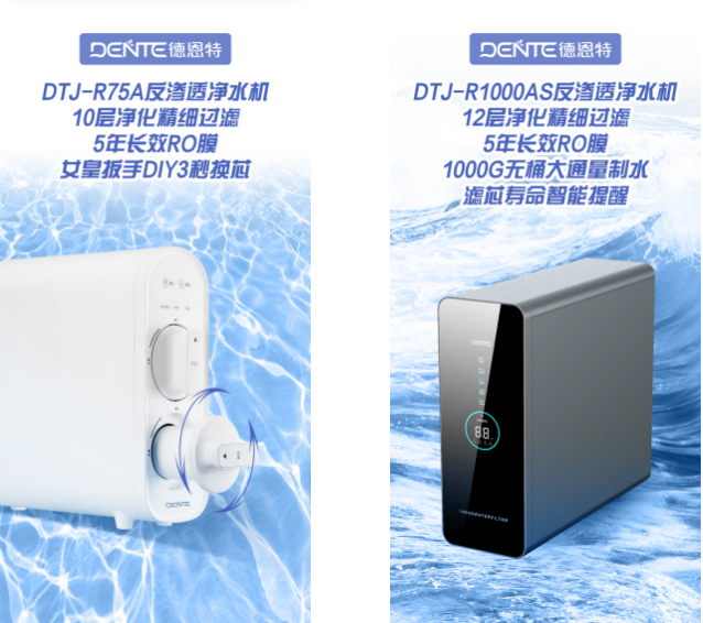在饮水健康方面,德恩特净水机展现了全面的技术考量。其产品采用5年长效RO膜,并升级膜页数量以提升过滤效能与耐用性。水路系统不含双酚A,保障母婴饮用安全。微废水技术达到国家一级水效标准,回收率 65% 以上,达到 2.5:1 的纯废水比,更为环保节能。此外,滤芯寿命智能提醒、可视化设计以及独特的“女皇扳手”DIY换芯功能,都极大提升了产品的易用性和用户体验。
