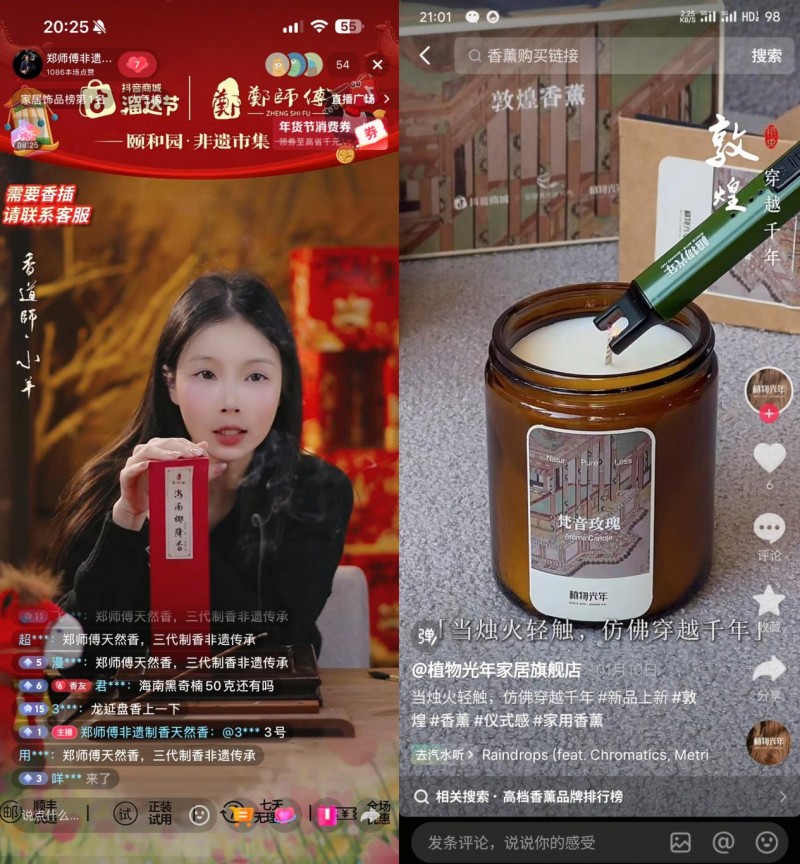 两款敦煌联名商品鄭師傅香薰旗舰店的非遗线香和植物光年家居旗舰店的敦煌香薰,凭借“非遗+文创+人设+好设计”优势,迅速攀升至各自店铺销售TOP行列,不仅实现了店铺成交额的增长,更将商品从“卖材质、卖工艺”提升到“卖意境、卖仪式感”,有效提升了品牌调性。