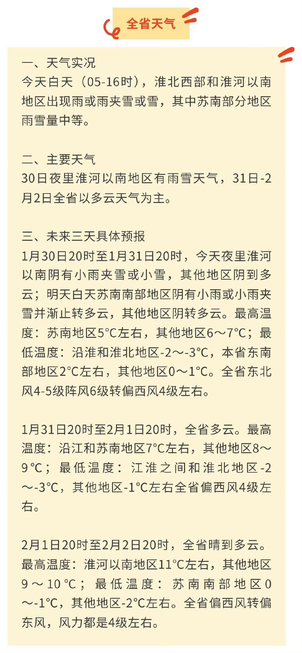 今夜(30日夜里),淮河以南地区将持续遭遇雨雪天气,预计30日20时至31日20时,淮河以南阴有小雨夹雪或小雪,其他地区阴到多云;31日白天,苏南南部地区阴有小雨或小雨夹雪并渐止转多云,其他地区阴转多云,全省最高温度苏南地区约5℃,其他地区6~7℃,最低温度沿淮和淮北地区-2~-3℃,东南部地区2℃左右,其他地区0~1℃,东北风4—5级阵风6级转偏西风4级左右。后续天气将逐步转好,1月31日20时至2月1日20时全省多云,2月1日20时至2日20时晴到多云,气温也将稳步回升,2月4日最高气温将达到14℃及以上。