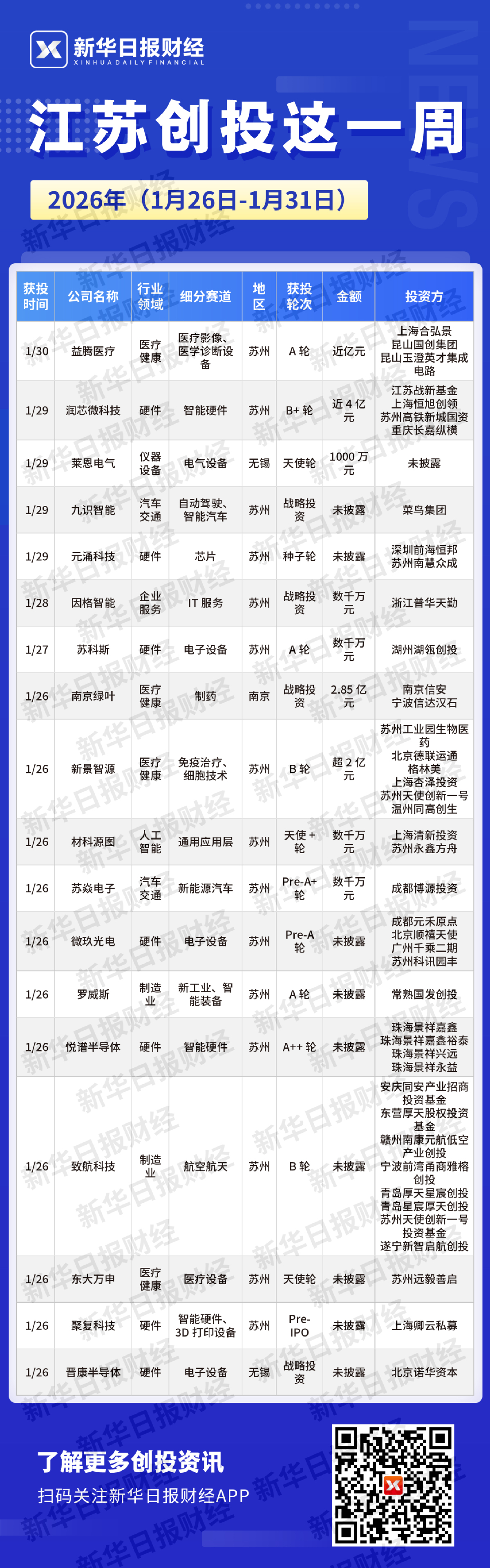 产业基金方面,1月26日,南京市召开新闻发布会解读《关于加快培育新质生产力推动高质量发展的若干政策(2026年版)》,提出构建总规模超2000亿元的“4+N”产业基金集群,市财政预算安排28.76亿元支持新质生产力发展。1月19日,南京新工医疗健康强链并购基金完成备案,规模8亿元,拟扩募至20亿元,聚焦南京“2+6+6”创新型产业体系。