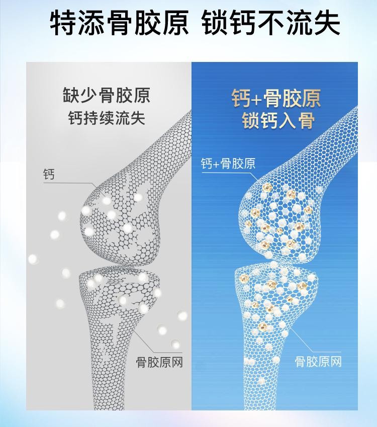 在维生素复配层面,精准添加维生素D3与K2,构建“补得进、锁得住”的科学体系——维生素D3促进钙质高效穿透肠道屏障,维生素K2则引导钙质定向沉积于骨骼和软骨组织,杜绝钙质浪费。