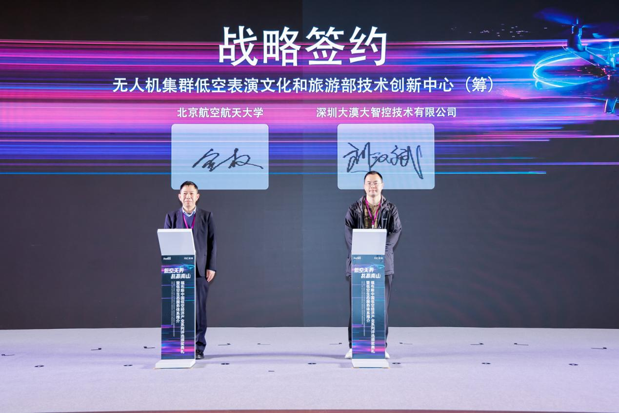 随后,深圳大漠大智控技术有限公司创始人&董事长、无人机集群低空表演文化和旅游部技术创新中心(筹)主任刘汉斌与北京航空航天大学自动化科学与电气工程学院教授、自动化科学与电气工程学院自动控制系书记全权,就共同建设“无人机集群低空表演文化和旅游部技术创新中心”签署了正式合作协议。此次签约标志着这一国家级技术创新平台的建设进入实质性的产学研深度融合新阶段。依托大漠大在产业应用与商业实践上的领先优势,结合北京航空航天大学在无人机集群协同控制、自主导航等领域的顶尖科研力量与人才储备,双方将聚焦文旅行业前沿需求,共同开展关键技术研发与行业解决方案创新。通过产学研协同机制,推动低空经济关键技术研究、系统集成能力提升及产业化应用落地。