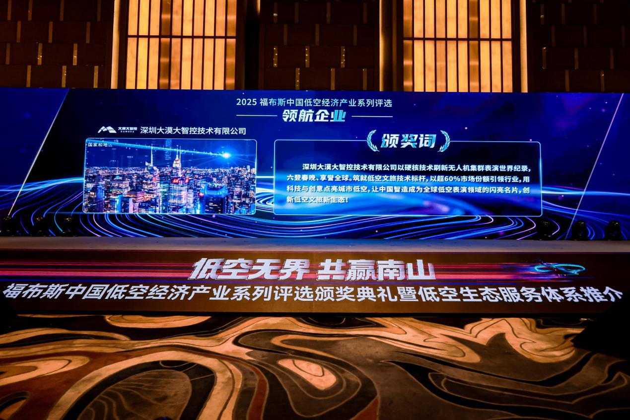 在本次评选中,深圳大漠大智控技术有限公司(以下简称“大漠大”)荣获“领航企业”奖,同时于颁奖典礼现场联合各方共同发布《低空经济场景创新案例集(2025)》,并以一场专属的夜空光影秀,向世界宣示中国科技企业在低空经济领域的创新高度与艺术表达深度。