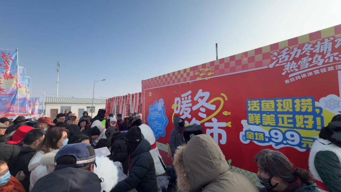 为了让更多游客能把乌尔禾的鲜美与福气带回家,活动特别设置了充满惊喜的抽奖环节。游客可以前往主舞台后方的“暖冬渔市”,以每公斤9.9元的超值价格购买刚刚出湖的新鲜渔获,并现场抽取幸运观众派发奖品,奖品丰厚实用,包括20张10串烤肉券、10张鲜鱼券以及50张鹿鸣酒店兑换券。这一“可吃、可玩、可中奖”的惠民安排,迅速吸引了大量游客有序排队参与。大家在工作人员引导下,一边选购鲜鱼,一边期待幸运降临,现场洋溢着“接福气、纳喜悦”的欢乐氛围。主办方也温馨提醒游客注意安全、文明参与,确保这份冬日的收获既开心又安心。