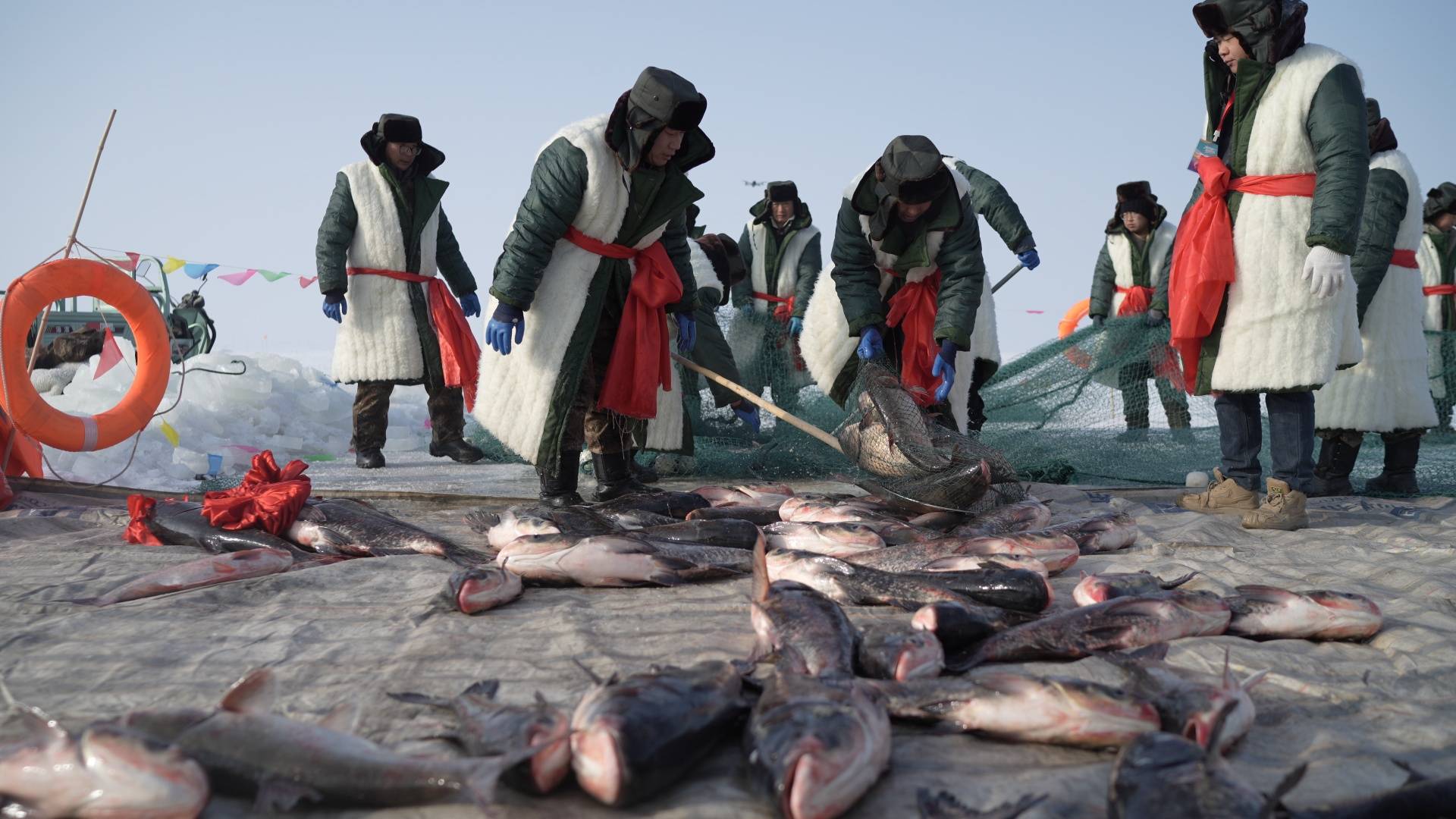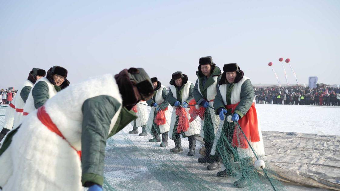 当然,作为冬捕活动的精髓,“头鱼拉网”环节依旧是全场瞩目的焦点。在经验丰富的“渔把头”指挥下,渔工们通过一系列富有智慧与力量的作业——定位、凿眼、下网、围捕,最终将蕴藏一冬生机的鱼群从冰下捞出。当巨大的渔网从冰洞中缓缓升起,无数鲜活肥美的鱼儿在阳光下闪烁着银光,腾跃翻涌,现场顿时爆发出阵阵惊叹与欢呼。这一过程,生动展示了人与自然协作的智慧。