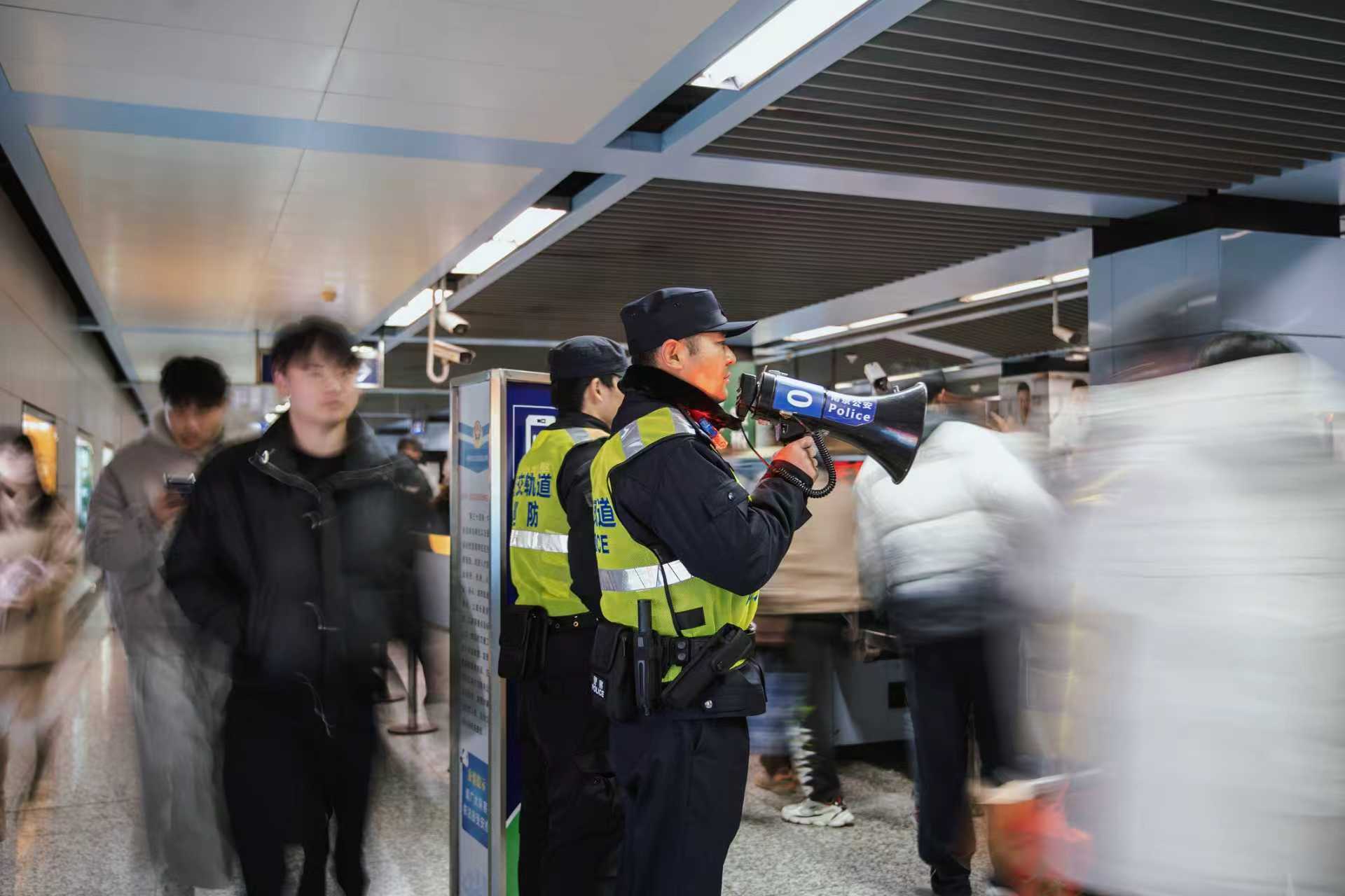 在高铁站的地下,地铁南京南站作为4线交汇的换乘大站,春运期间将面临大客流考验。为此,公轨公安在地铁区域增设了多个执勤点位,实行网格化巡防与定点值守。“为应对大客流,我们在站厅站台设置了客流缓冲区,适时引导单向通行。需要乘坐地铁的旅客可以选择2、3、4号口,无缝衔接地铁区域,无需二次安检。”南京南站派出所民警陈康辉介绍。