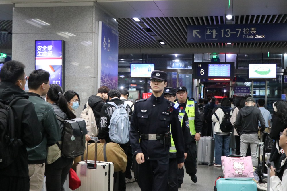 与高速公路的川流不息相比,南京南站则呈现另一番繁忙却有序的景象。上午11时,北广场进站口人流如织,旅客们在工作人员引导下依次通过安检。公交轨道公安局南京南站派出所副所长窦智正带领队员在人群中巡逻,“春运首日往往迎来首波出行高峰,我们的巡逻范围覆盖地面和地下地铁区域,全力保障旅客平安。”为确保旅客平安出行,南京公轨警方全面加强了警力部署,联动特警、武警开展武装巡逻。