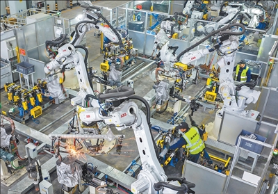 中国是ABB全球最大的机器人交付市场。图为在浙江省湖州市一家新能源汽车部件企业,ABB机器人正在作业。