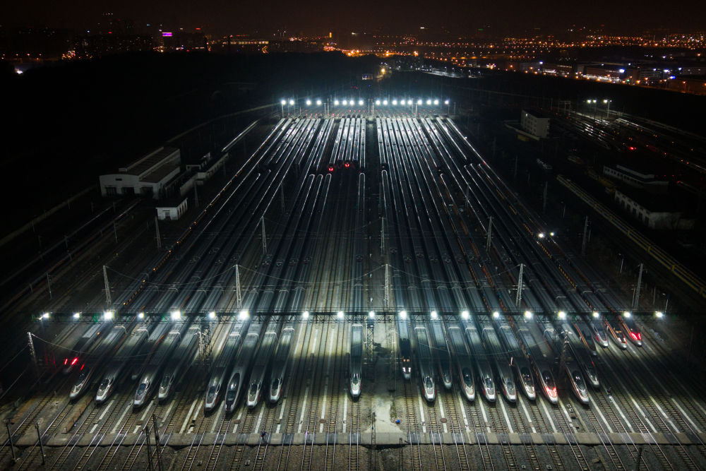 2026年2月2日凌晨,检修完的动车组列车停靠在长沙动车运用所(无人机照片)。新华社记者 陈思汗 摄