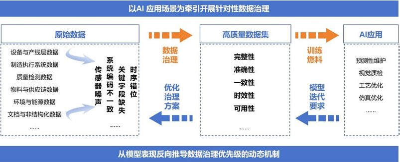进一步提升人工智能技术在制造业领域的融合应用水平,首先要理清数据治理与人工智能是什么样的关系。人工智能应用的核心是依托高质量数据完成模型训练、推理与迭代,数据治理则是保障数据质量的核心抓手,人工智能应用的深化,反向推动数据治理工作从“被动合规”向“主动价值驱动”升级。