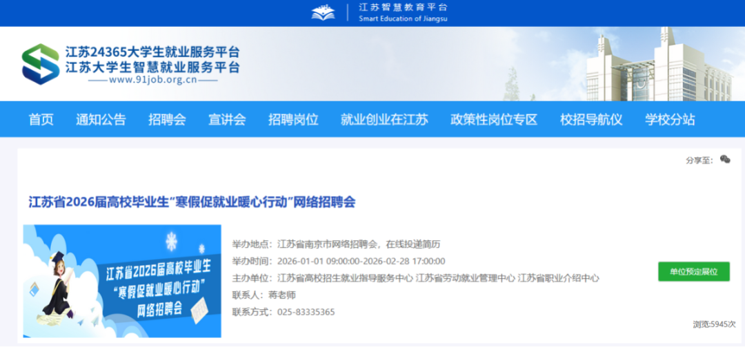 130场高校毕业生“寒假促就业暖心行动”网络招聘会,现已上线江苏24365大学生就业服务平台。