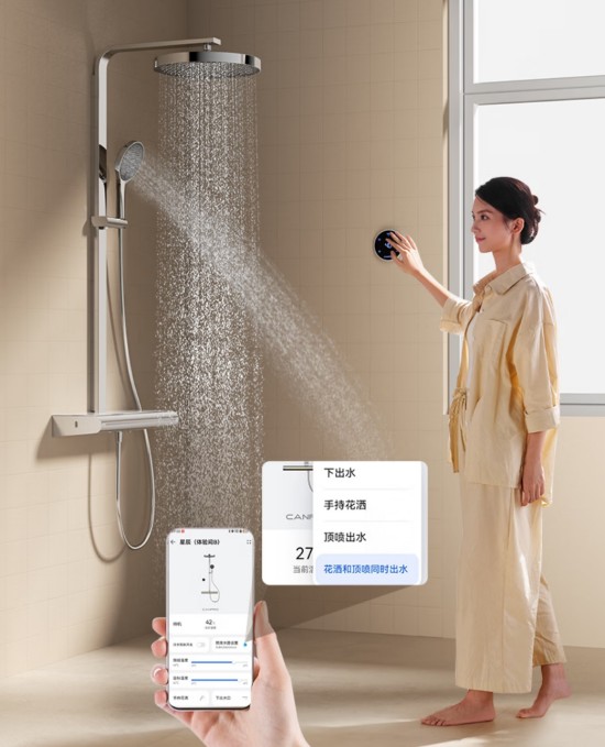 这是智能卫浴行业首款全触屏鸿蒙智联花洒,支持选择顶喷或花洒提前预排冷水,联动鸿蒙智联镜柜、毛巾架等生态产品,重新定义沐浴的仪式感。