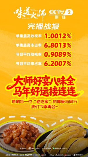 节目在央视播出期间收视一路飘红,表现亮眼:开播首日收视率即在全上星频道同时段突破1%,迎来开门红;平均收视率达0.9089%,平均市占率为6.2007%,平均收视位居全上星频道同时段科教类目第2、多期节目收视率也雄踞同时段前3。其中,随着节目热度不断攀升,单集最高收视率达1.0012%,最高市占率更创下6.8013%的佳绩,充分印证了其广泛的大众吸引力和强大的话题影响力。至此,《味道大师》不仅以“酸甜苦辣咸鲜臭麻”的八味叙事创新了美食纪录片的表达,更以扎实的收视成绩证明了其内容价值,赢得了观众与业界的一致赞誉。