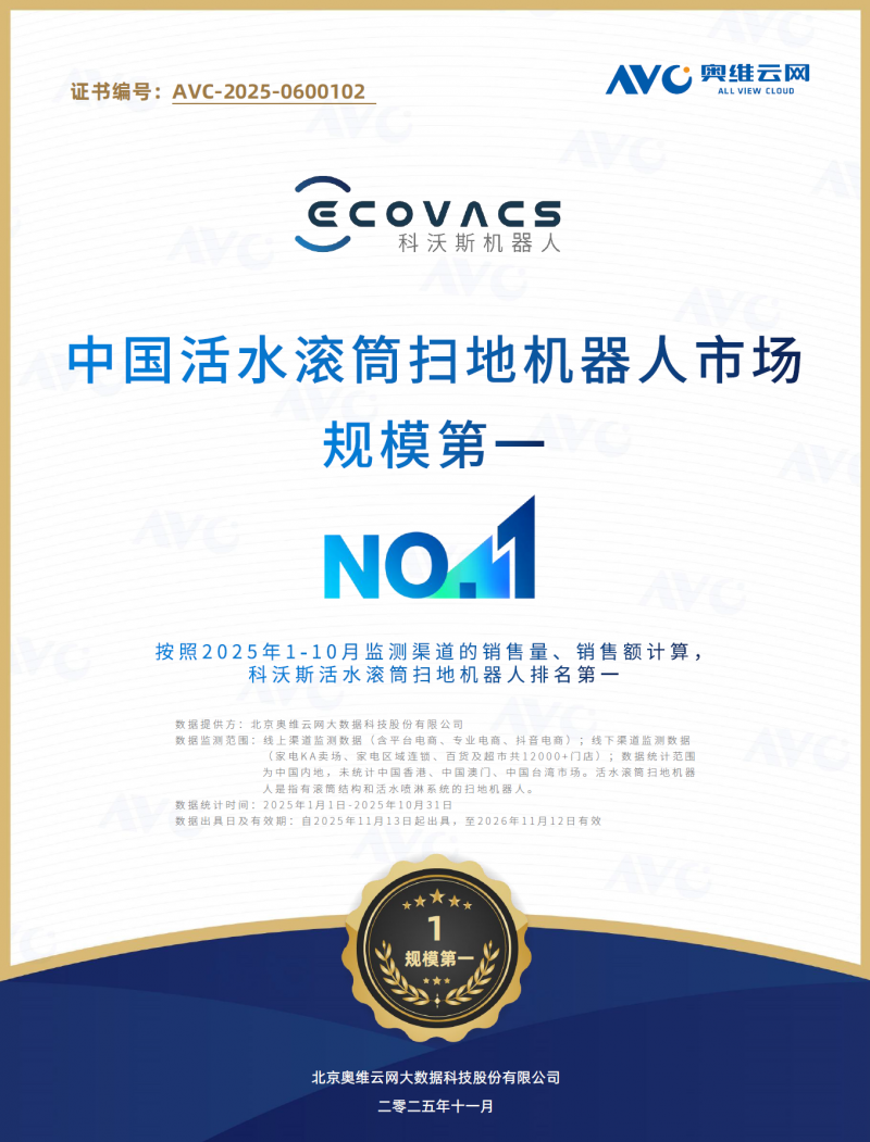事实上,科沃斯的这种“断层式领先”并非偶然,就在前不久,科沃斯就已凭借压倒性优势荣获了权威机构奥维云网(AVC)的官方认证,斩获“中国滚筒活水洗地机器人市场规模第一”。数据显示,科沃斯滚筒活水系列以91.5%的销额占比和91.9%的销量占比拿下双第一,而本次洛图科技(RUNTO)的全渠道销量数据,实际上是对科沃斯市场统治力的又一次印证,构成了从专项赛道到全渠道市场的双重统治力闭环。
