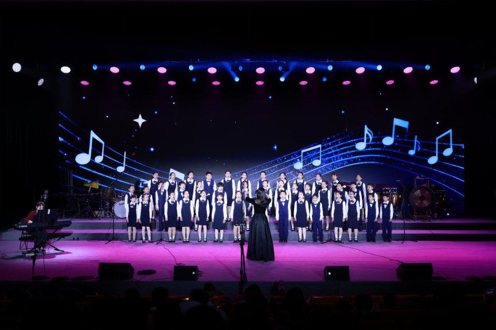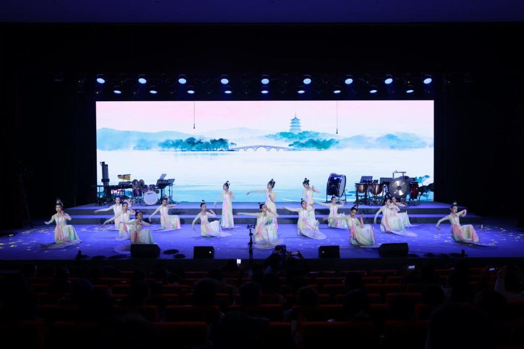 成果展示环节,合唱、舞蹈、行进打击乐、弦乐与管乐合奏等节目精彩纷呈:合唱团演绎多首中外经典作品,展现出校园美育浸润下的纯真与灵动;舞蹈《西子湖·初妆》以东方美学为底色,勾勒出含蓄温润的艺术气质;行进打击乐《雄狮少年》节奏铿锵、气势昂扬,尽显少年一代蓬勃向上的精神风貌。