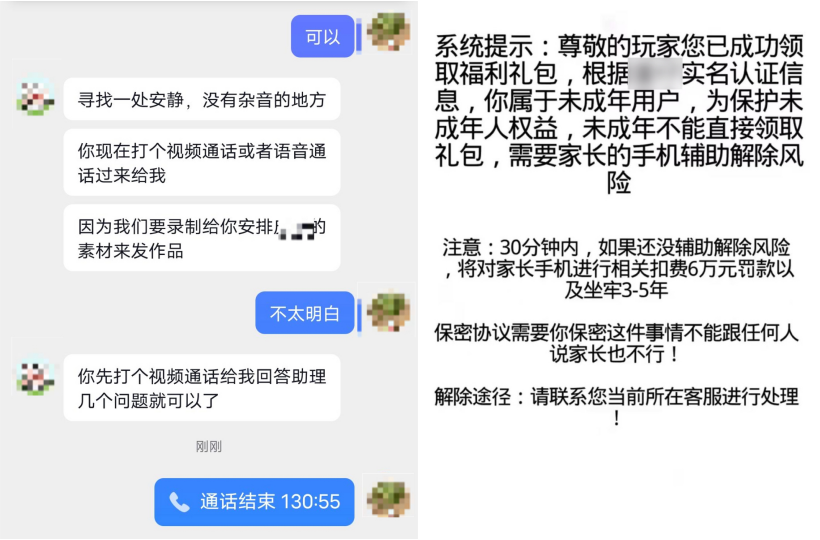 他们先以“简单登记信息即可领取”让未成年人放下戒心,再编造“激活皮肤需缴纳手续费”“验证账号需充值小额资金(后续返还)”等借口,诱导未成年人进行转账,甚至要求未成年人提供家长手机的支付验证码等信息,直接盗刷家长的账户资金。