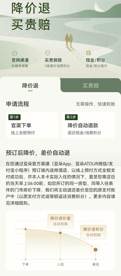 具体来说,降价退指的是,亚朵会员在官方渠道完成订房后,一直到离店日6点前,如果订单中相同条件的房间降价,无需会员手动申请,系统将主动触发退款流程,自动进行差价赔付——入住前降价自动退现金,入住当天降价返还等额积分,积分可直接用于后续酒店预订、亚朵零售产品兑换等,实实在在让消费者的出行全程无忧、省心省力。