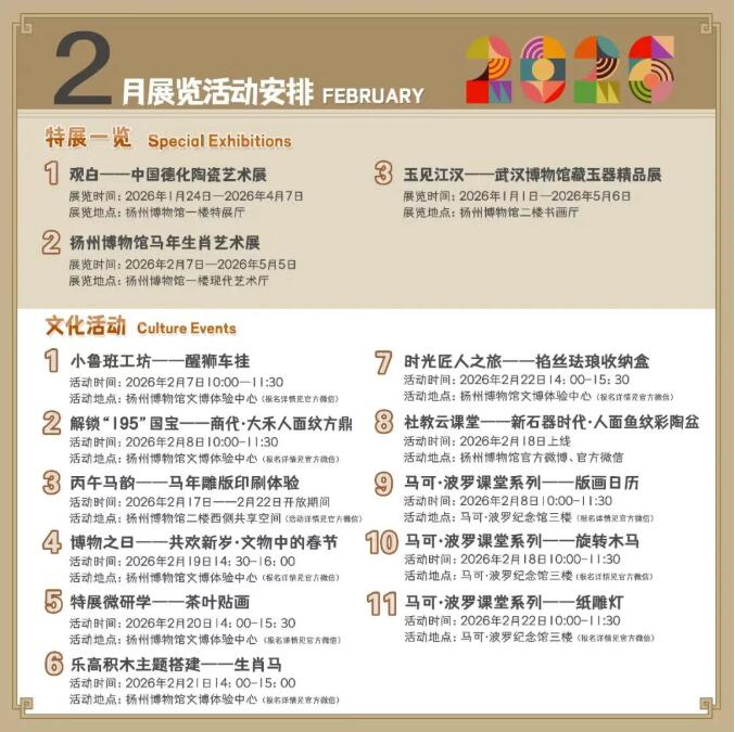 南京市博物馆《意必吉祥——馆藏明清吉祥纹饰瓷器展》,太平天国历史博物馆《以梦为马——丙午马年生肖展》南京市民俗博物馆《阅春——丙午马年民俗民艺展》……春节寒假即将到来,除了周一不闭馆,南京市博物总馆还准备了一系列活动。详情>>