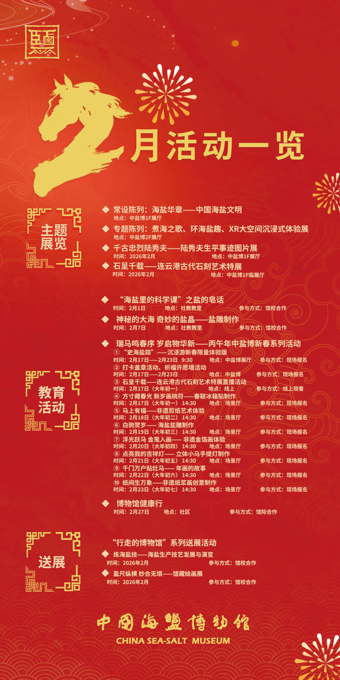 泉流四海——无锡博物院藏历代金属货币展、石呈千载——东海云台山石刻印象展等特色展览;“祥龙迎新春·骏马启祥瑞”——舞龙闹春表演、“秦马汉象大闯关”——集福有礼VR体验活动等12个文化活动,诚邀您新岁共聚,纳福迎新,共度温情流转的中国年。详情>>