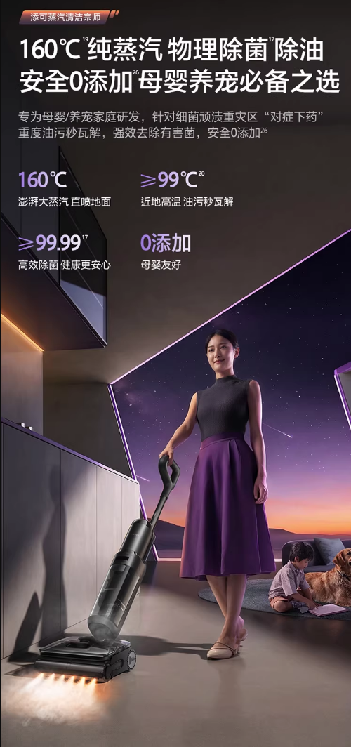 其核心武器,是高达160℃的高温蒸汽直喷技术。洗地机能将纯水迅速加热并提纯为澎湃的高温干蒸汽,直达地面时依旧能保持99℃以上的高温,瞬间溶解并剥离那些凝固已久的酱汁、动物油脂和菜汤,实现物理方式的强力去污,全程无需化学清洁剂,对有宝宝和宠物的家庭格外友好。