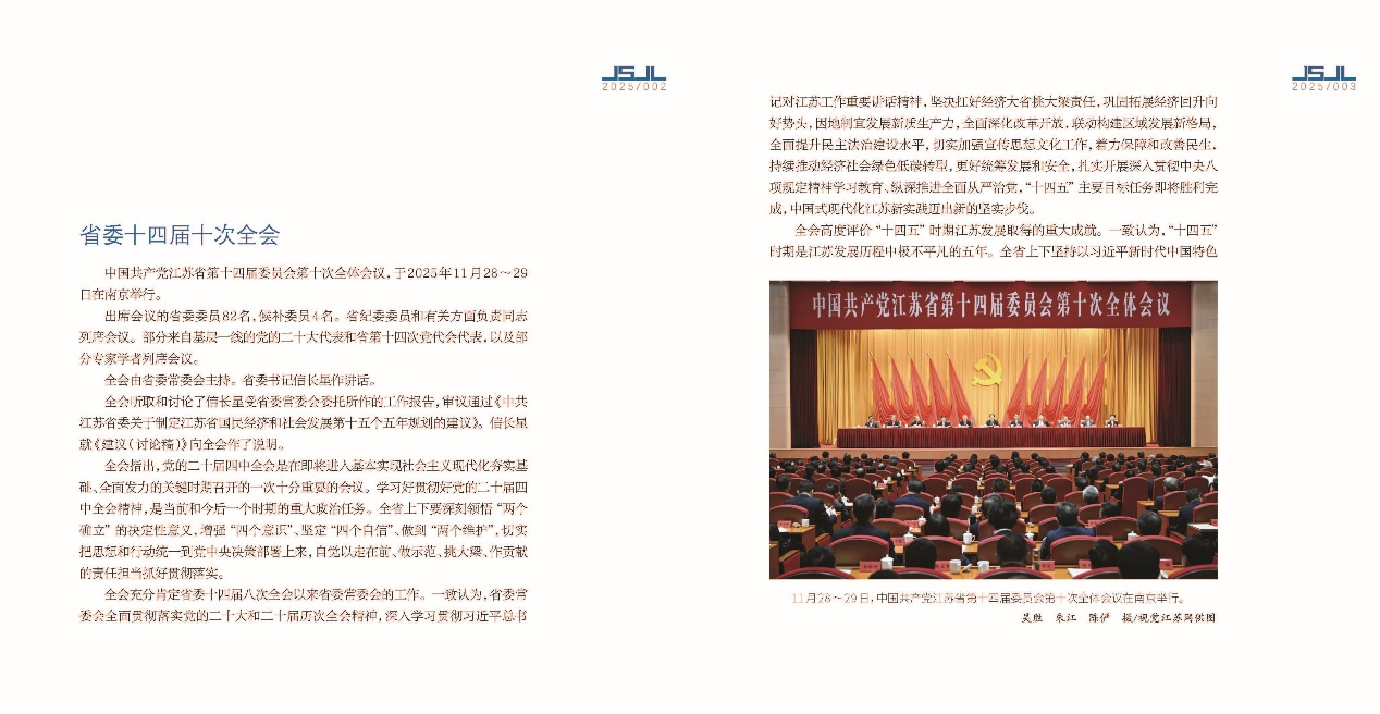 《江苏记录(2025)》全书约27万字,设有专题、创新驱动、经济发展、对外开放、区域发展、生态环境、文化建设、社会民生、大事要闻9个栏目,全面、客观、系统地记述了2025年江苏在科技自立自强、经济质效提升、高水平对外开放、区域协同创新、生态文明建设、文化繁荣发展、民生福祉增进等领域的扎实进展与显著成效,清晰勾勒出江苏高质量发展的年度全景画卷。其中,“专题”栏目精心收录“省委十四届十次全会”“辉煌‘十四五’”“‘苏超’纪事”3篇专文,既聚焦全省重大决策部署落地见效,又系统梳理“十四五”时期发展成就、回望年度亮点瞬间,以宏大叙事与细腻笔触相融,既凝聚起奋进新征程的磅礴力量,又彰显了江苏“挑大梁”的使命担当。