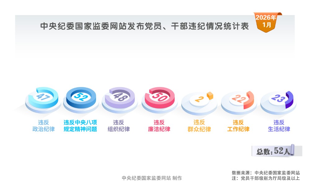 2026年1月,中央纪委国家监委网站发布的52条党纪政务处分信息中,47人违反政治纪律,52人违反中央八项规定精神,48人违反组织纪律,50人违反廉洁纪律,2人违反群众纪律,22人违反工作纪律,23人违反生活纪律。