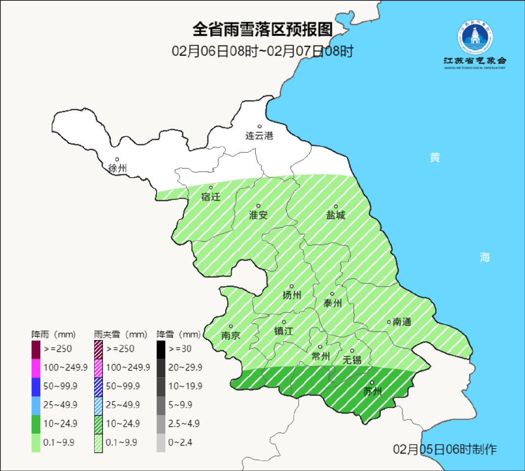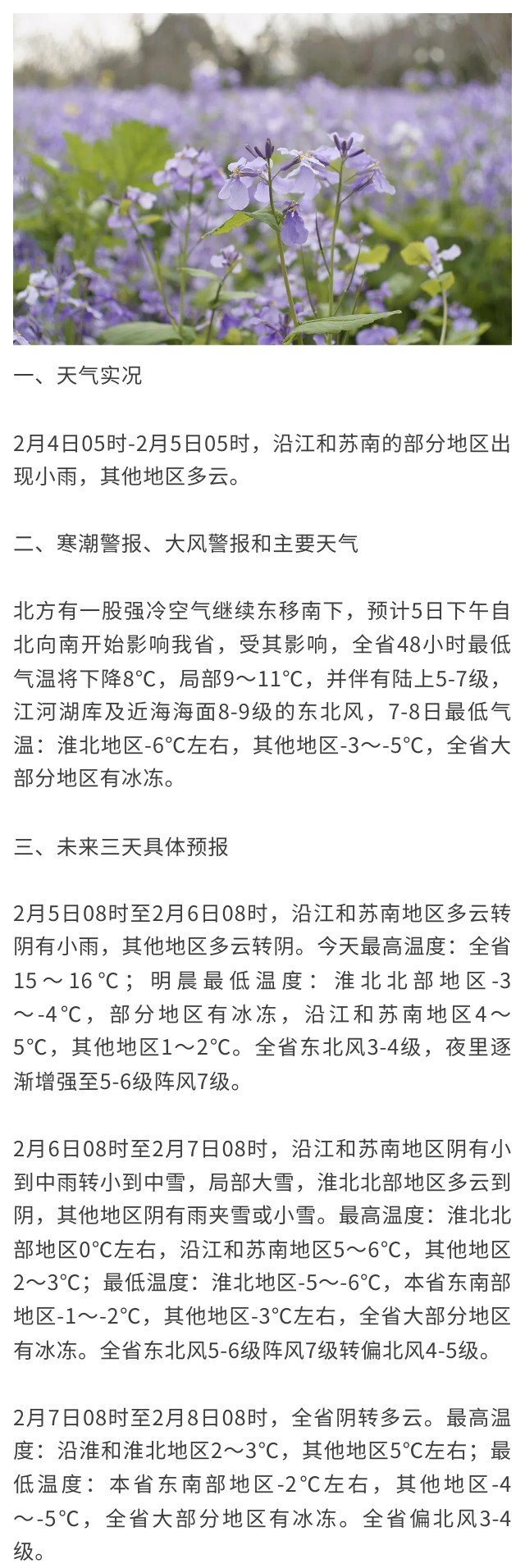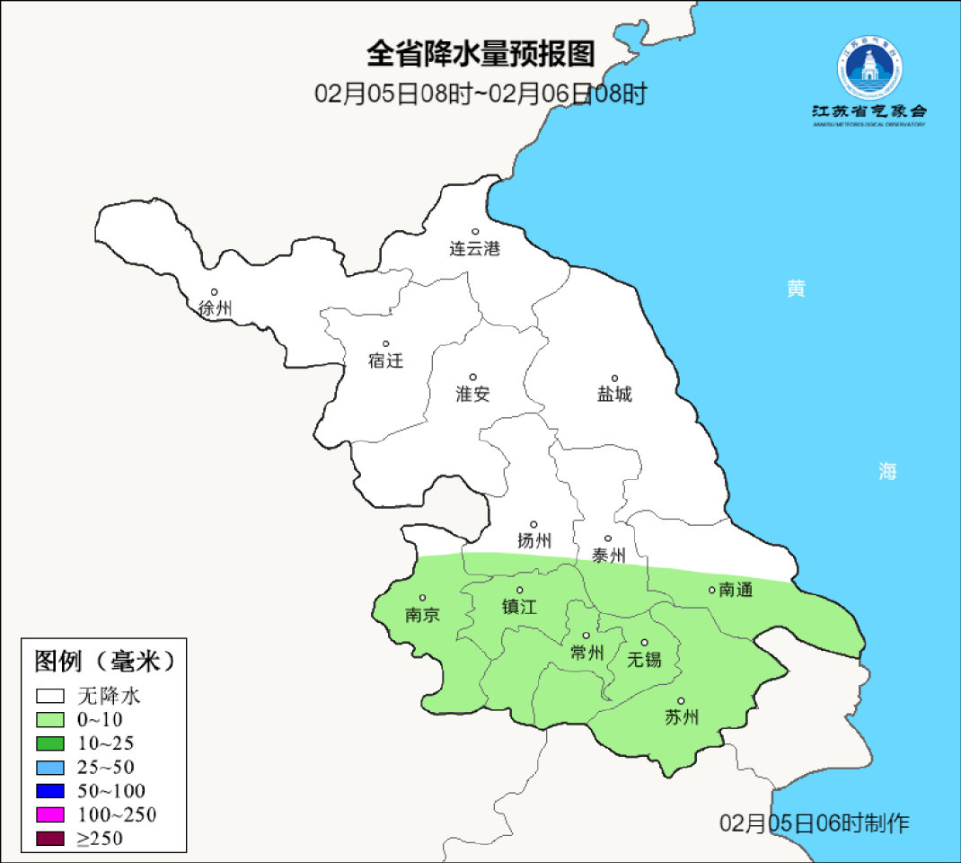 2月5日08时至2月6日08时,沿江和苏南地区多云转阴有小雨,其他地区多云转阴。今天最高温度:全省15~16℃;明晨最低温度:淮北北部地区-3~-4℃,部分地区有冰冻,沿江和苏南地区4~5℃,其他地区1~2℃。全省东北风3-4级,夜里逐渐增强至5-6级阵风7级。