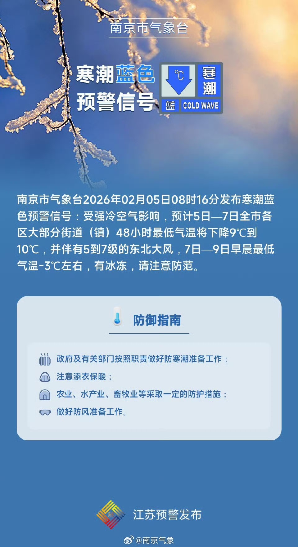 交汇点讯 南京市气象台2026年02月05日08时16分发布寒潮蓝色预警信号:受强冷空气影响,预计5日—7日全市各区大部分街道(镇)48小时最低气温将下降9℃到10℃,并伴有5到7级的东北大风,7日—9日早晨最低气温-3℃左右,有冰冻,请注意防范。
