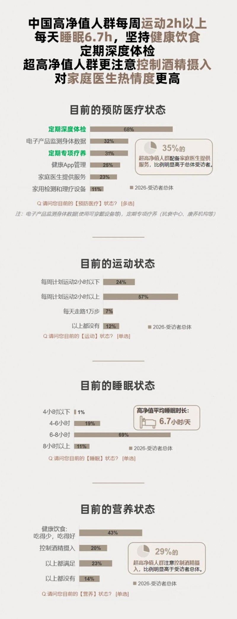 2025年全球畅销书《超越百岁》中提及长寿的五大支柱为运动、营养、睡眠、情绪、预防医疗。其中在预防医疗方面,68%的受访者会定期进行深度体检;31%会定期前往抗衰中心、康养机构等进行专项疗养,其中以U35和U40为主。在生活方式方面,生活重心向“身心平衡”倾斜,81%的受访高净值人士每周都有运动计划;43%的受访者坚持健康饮食(吃得少,吃得好)。