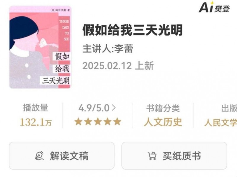 想要在迷茫中唤醒对生活的热爱,挣脱情绪内耗的枷锁,不妨听听李蕾解读的《假如给我三天光明》。海伦·凯勒用生命书写的炽热篇章,在李蕾的讲述中化为可触可感的生命力。那些对光明的渴望、对生活的热爱,会让你明白眼前的迷茫不过是人生路上的小小迷雾。我们应珍惜当下所拥有的,以热爱对抗前路的未知。