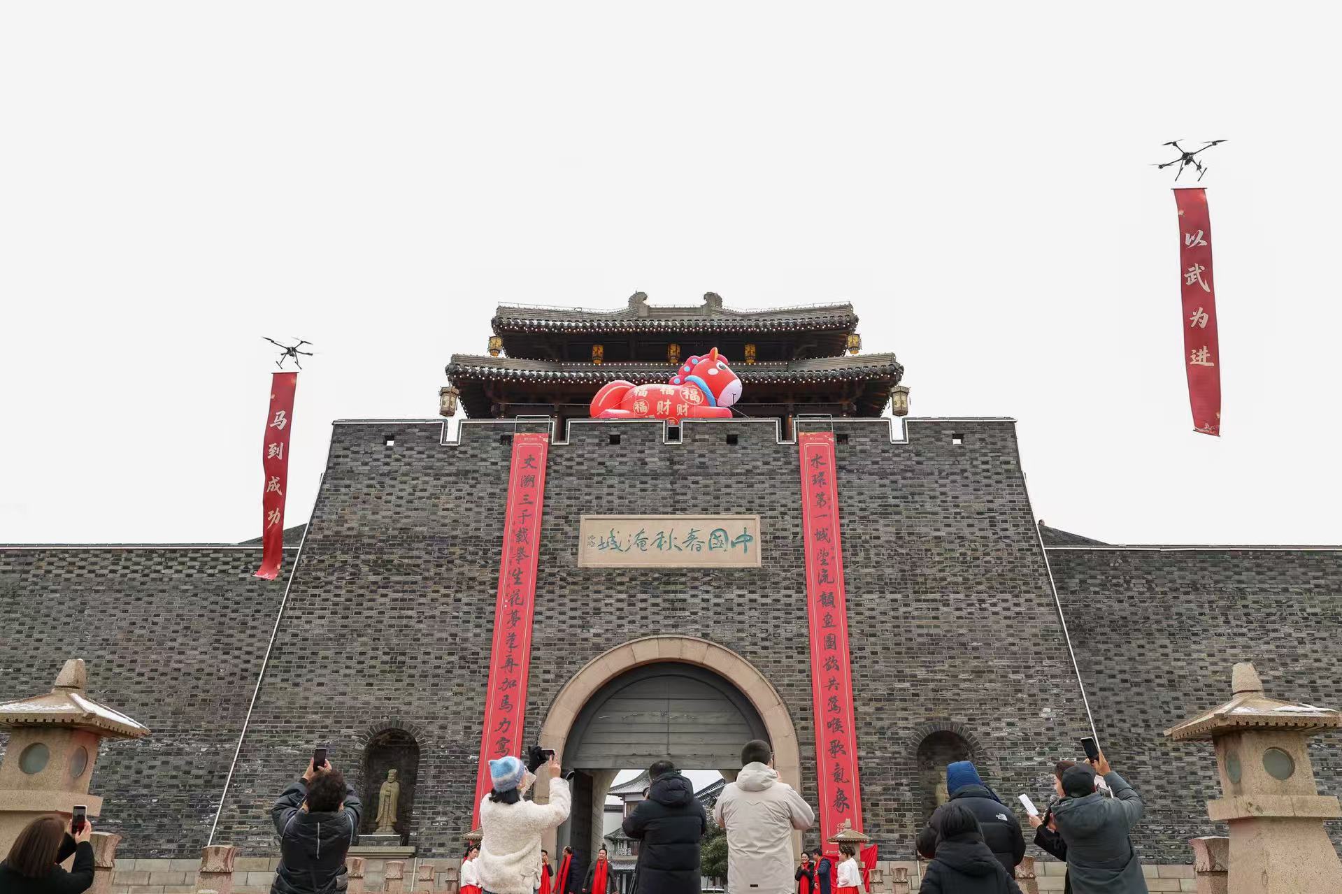 就在此时,一阵嗡嗡声引得众人齐齐仰头望向天空。只见2架无人机腾空而起,悬停在广场上空。在现代科技的加持下,一副特殊的“空中春联”缓缓展开——“以武为进 马到成功”。古老的城门挂联与现代的无人机送福在这一刻完美邂逅,传统文化与现代科技交相辉映,引得现场观众纷纷举起手机,记录下这穿越时空的浪漫一幕。