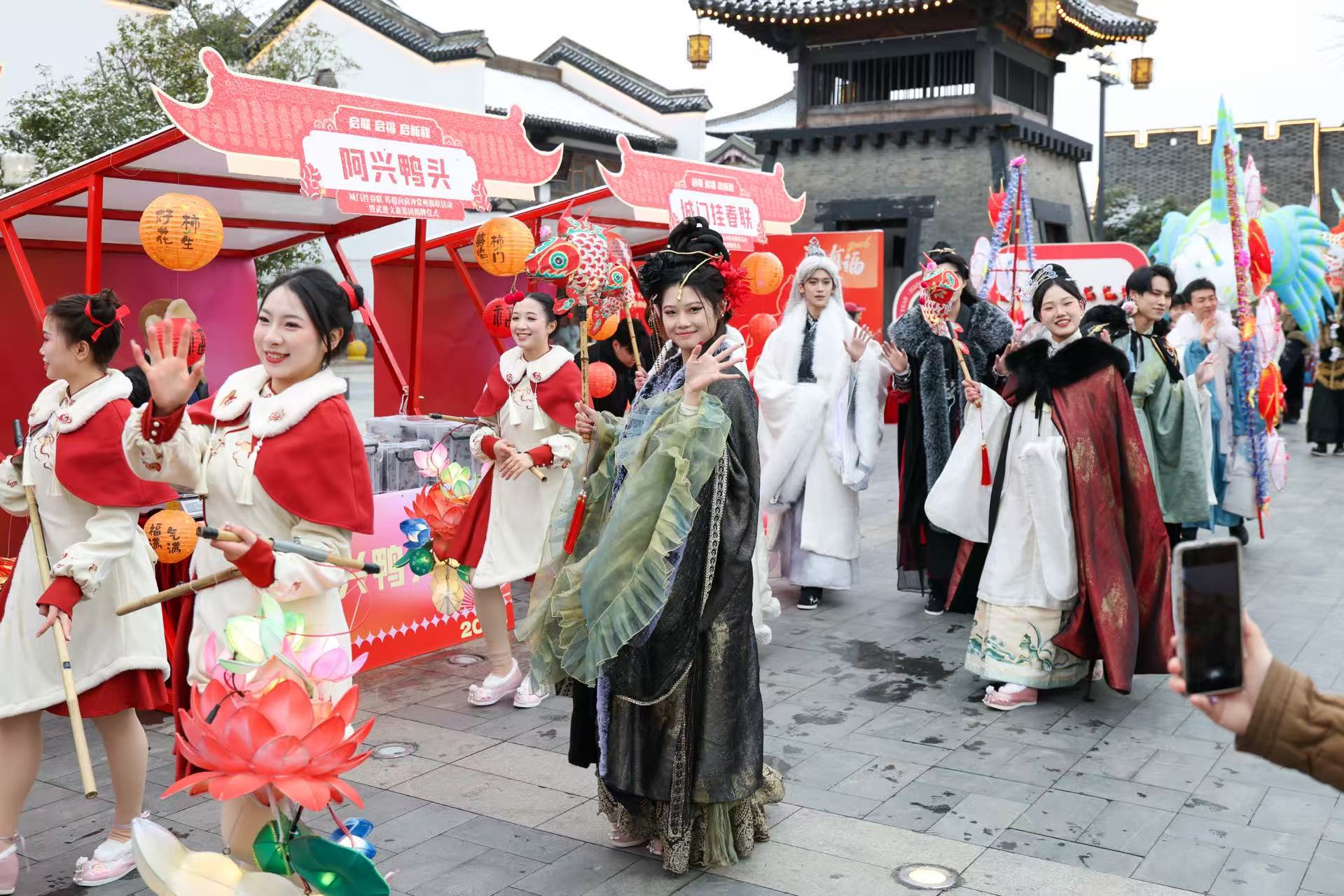 “3——2——1——请揭联!”主持人话音一落,领导和嘉宾们共同发力,红绸如飞瀑般滑落,两幅长达十余米的巨幅春联赫然显现——“水环第一城,望流韵画图,欲共莺喉歌气象;史溯三千载,举生花梦笔,再加马力写春秋。”