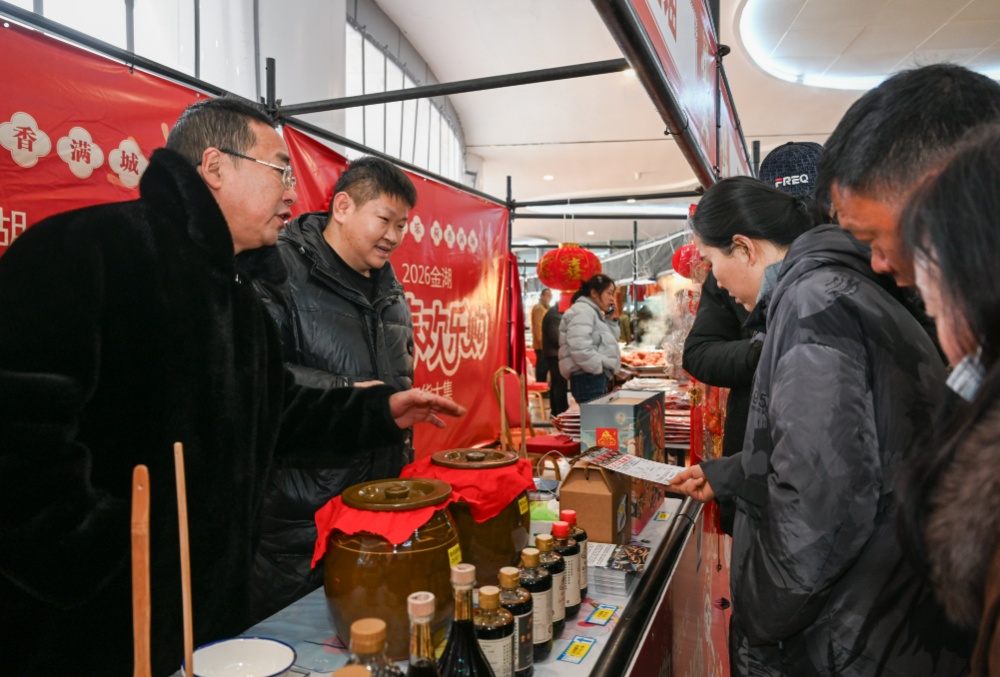 而在分会场金湖文化艺术中心内,同样人声鼎沸、其乐融融。新春年货展销区里,年节礼品、食品酒水、农特产品、数码家电、文旅周边等一应俱全。