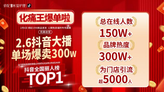 2月6日,俏妃寒湿护理专场直播“马年俏佳人 秀出美人肩”在抖音官方直播间圆满收官。本次直播以新品发布为核心,叠加多重宠粉福利,最终创下总在线超150万人、单场销量突破300万元的亮眼成绩,荣登丽人榜第一,为门店引流超5000人,为品牌马年营销打响开门红。
