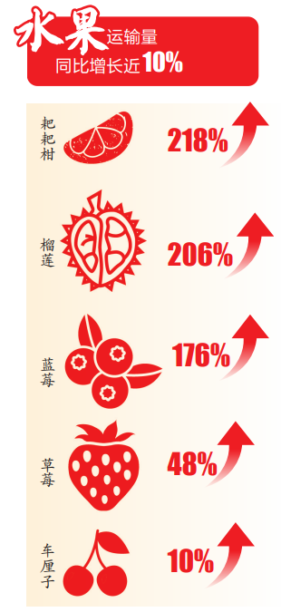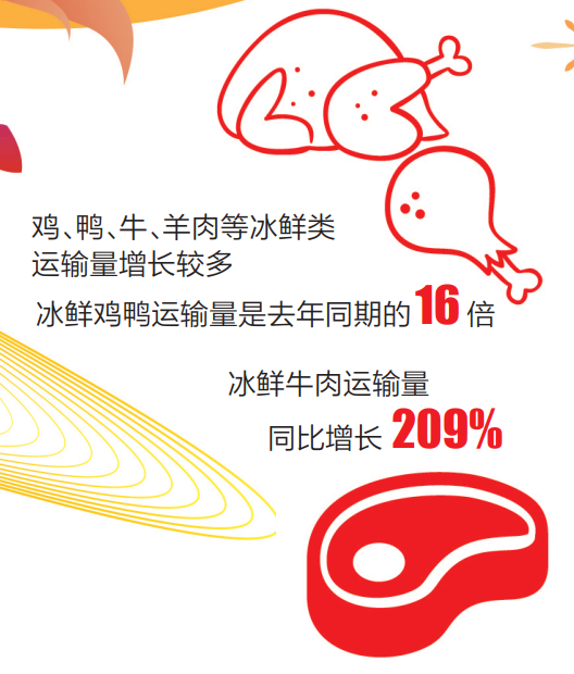 另外,冰鲜品整体运输量同比增长81%。冰鲜的鸡、鸭、牛、羊肉运输量增长较多,其中冰鲜鸡鸭运输量是去年同期的16倍,冰鲜牛肉运输量同比增长209%。