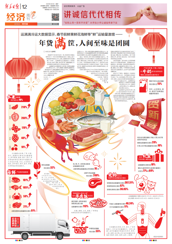 距离丙午马年春节还有一周,你家的年货置办得咋样了?今年年货有哪些新变化?除线上线下琳琅满目的商品之外,公路上跑着的货车里也藏满了“年味”。运满满冷运大数据显示,节前新鲜水果、冰鲜、海鲜等“鲜”运输量激增,尽显消费者对新鲜美好生活的热切追求。
