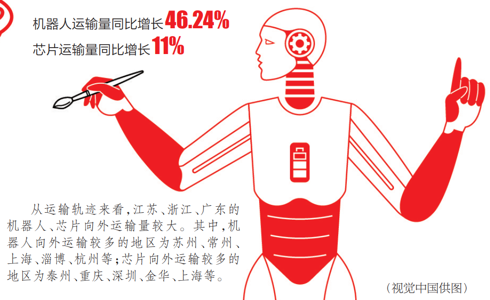 去年以来,机器人成为公众关注的焦点。数据显示,节前机器人运输量同比增长46.24%,芯片运输量同比增长11%。发货量较大的省份为江苏、浙江、广东。其中,苏州、常州、上海、淄博、杭州等地对机器人的需求量较大;泰州、重庆、深圳、金华、上海对芯片的需求量较大。