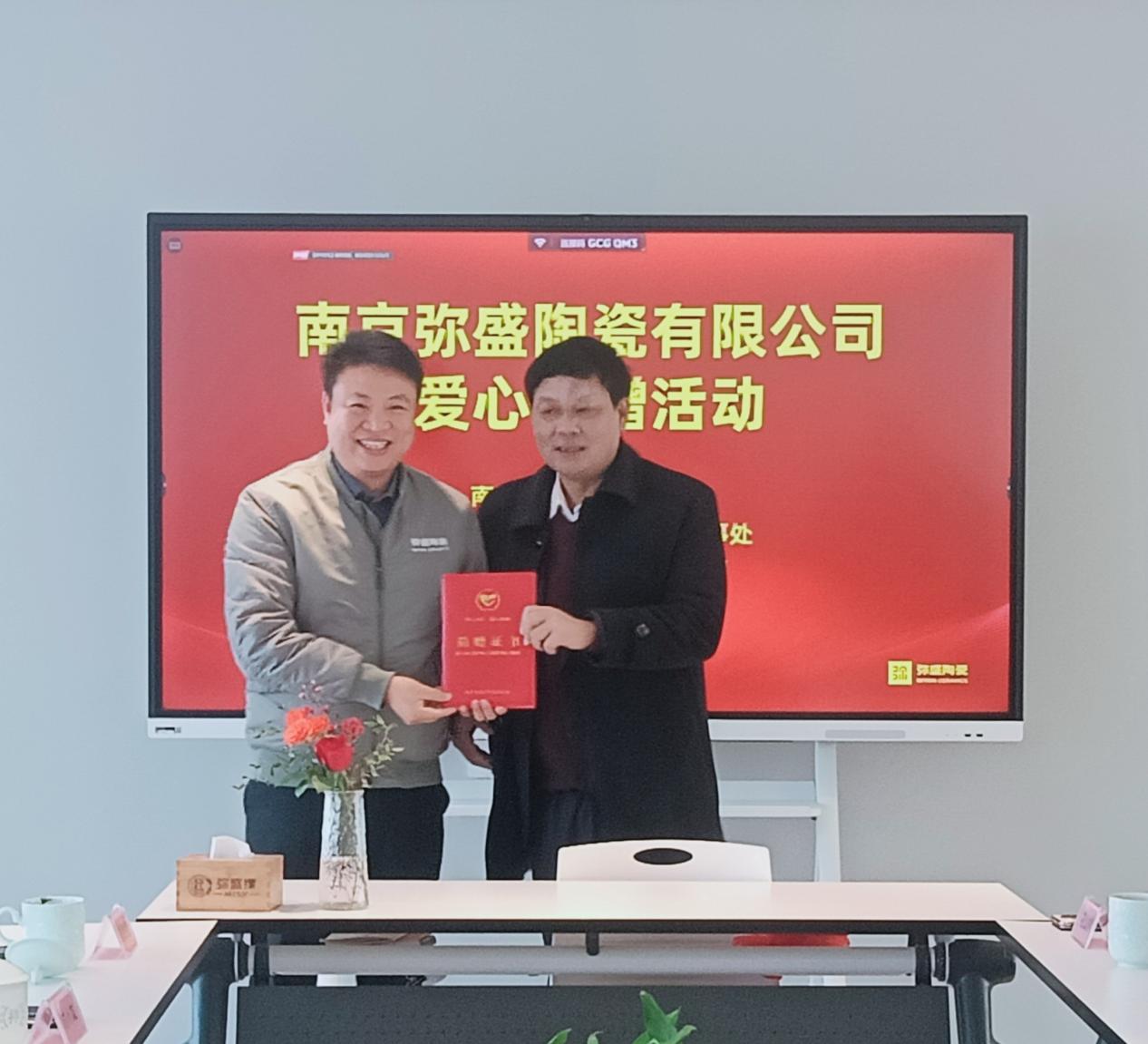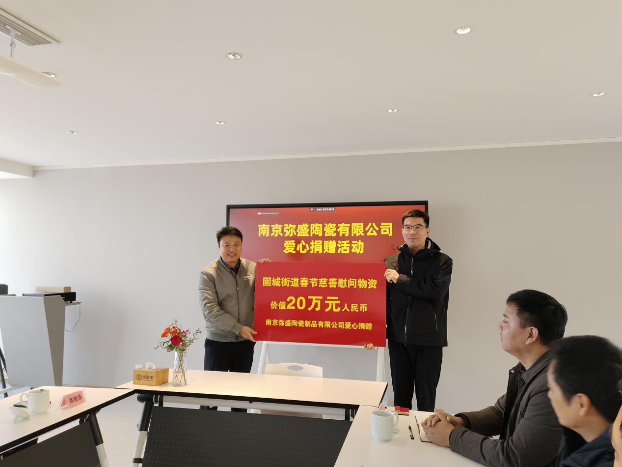 2月9日,捐赠仪式在弥盛陶瓷公司隆重举行。高淳区慈善总会会长赵火平、副会长兼秘书长袁晓荣、原慈善总会会长孔德华、固城街道党工委书记夏鹉、街道办事处主任孔维新、副主任孙贤长、各行政村党总支书记和部分困难家庭代表参加捐赠仪式。弥盛陶瓷有限公司总经理付小龙举牌捐赠,街道党工委书记夏鹉接牌受捐。赵火平向弥盛陶瓷公司颁发捐赠证书,现场爆发出热烈的掌声。