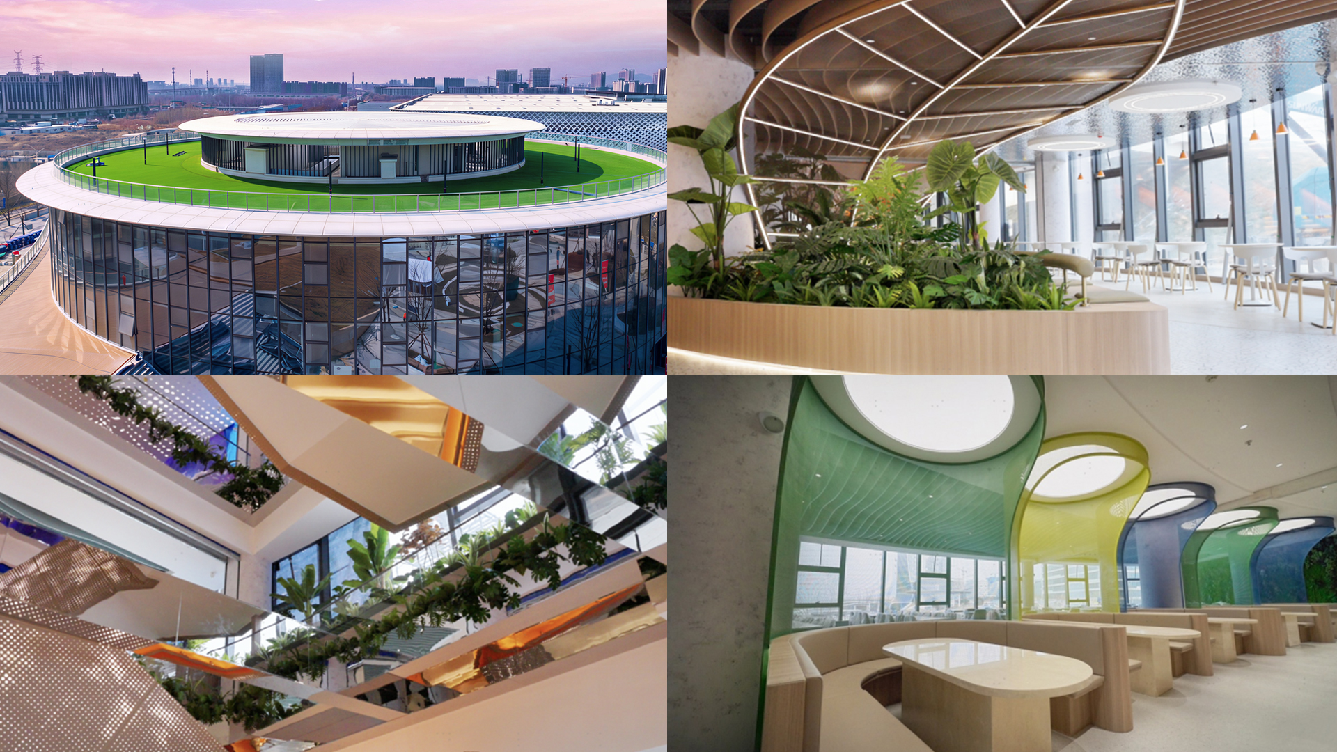 园区内国槐、银杏、五角枫随四季变幻,草坪屋顶与雨林中庭相映成趣,打造出兼具社交属性与自然体验的办公环境。