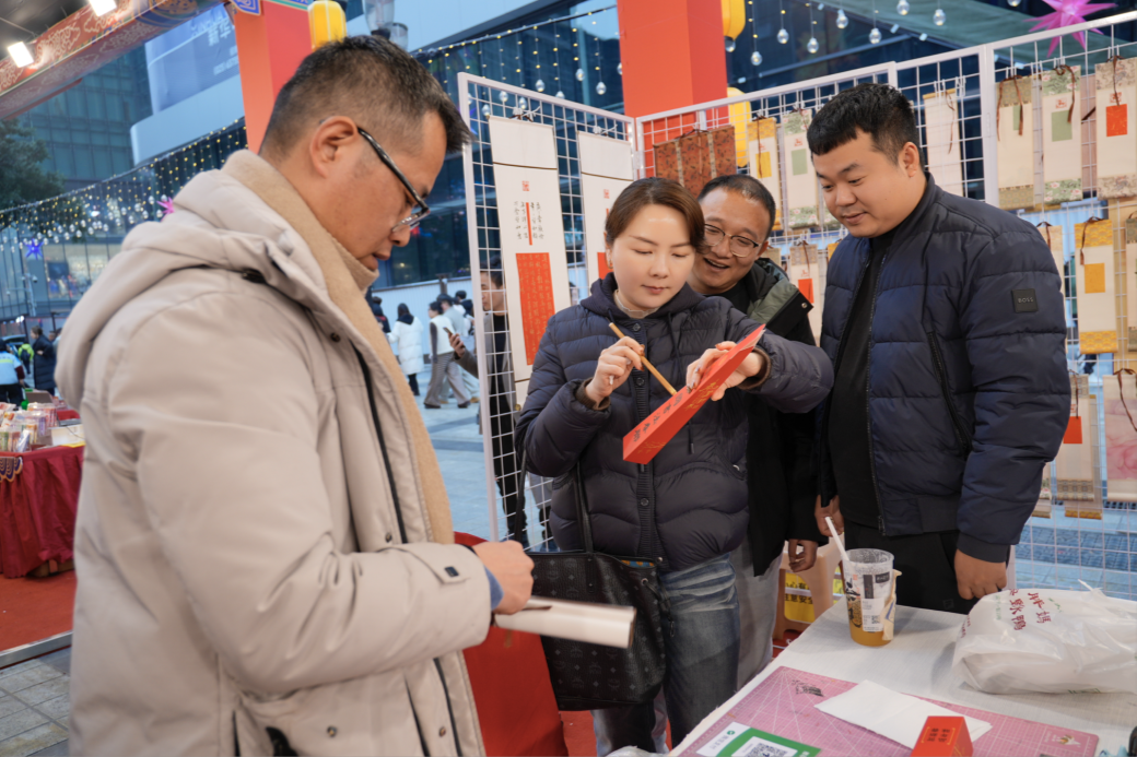 在解放碑重百新世纪年货市集上,漆画、扎染、书法画等各类非遗产品纷纷披上了“新年装”。采用扎染技艺制作的小马布袋、融入宋锦文化的刺绣“福”字、书写着“吉祥如意”“马上成功”等吉语的书法画……巧妙融入了马年意象与新春吉祥元素,吸引众多市民和游客驻足。