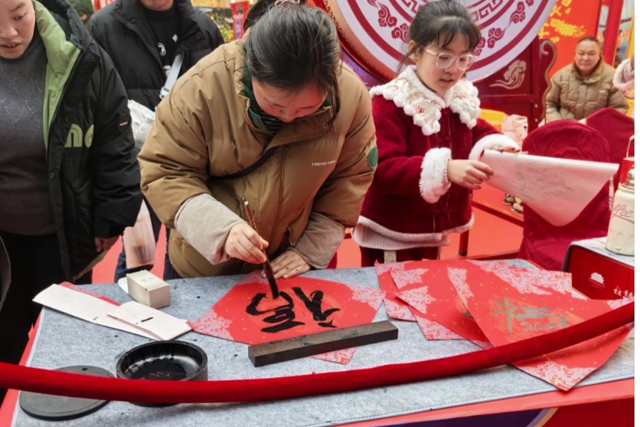 除了单纯的售卖外,现场还设置了多种传统文化互动体验,并特别邀请小朋友们担任志愿者。在写“福”字活动中,小志愿者们手握毛笔,在红纸上一笔一画认真书写福字,翰墨飘香间传递着新春的美好期许。“看着孩子对书法文化这么感兴趣,特别欣慰,这样的活动非常有意义,能很好地弘扬传统文化。”家长陈女士感慨道。