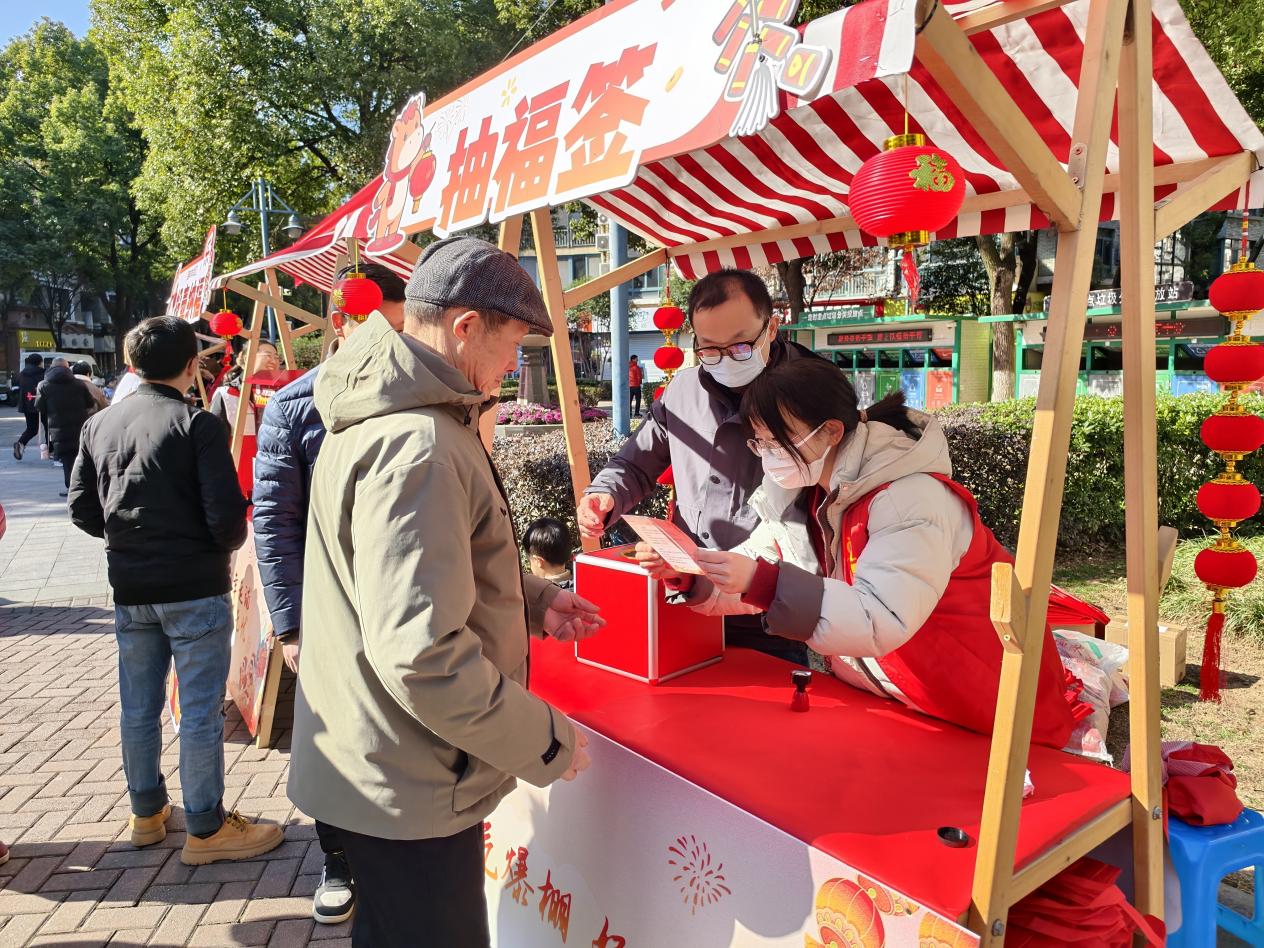 而在“趣味体验区”,则是欢笑与温情的交汇处,每一个点位都兼顾“一老一小”的体验感。挥毫泼墨的“写福字”摊位前,老人提笔挥毫寄寓安康祈愿,孩子临摹仿写感受年味底蕴,老老少少专注的模样格外动人;“套圈”“投壶”等传统游戏区,设置了适配老人的舒缓节奏和适合孩子的趣味难度,不时传来阵阵欢呼喝彩;义诊服务台前,专业医师重点为老人解答慢病调理、日常保健等疑问,同时也为孩子普及基础防护知识;消防反诈宣传点,工作人员用通俗易懂的语言和趣味问答,向老人和孩子普及实用安全知识,让关怀融入每一个细节。每完成一项体验,集章卡上便增添一枚独特的彩色“福”字印章,记录着“一老一小”每一次参与的快乐,也定格着社区的温情。