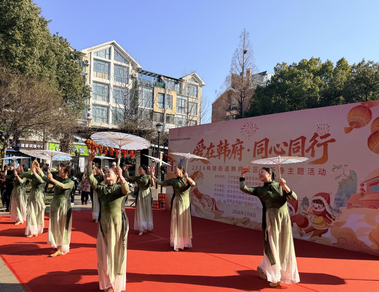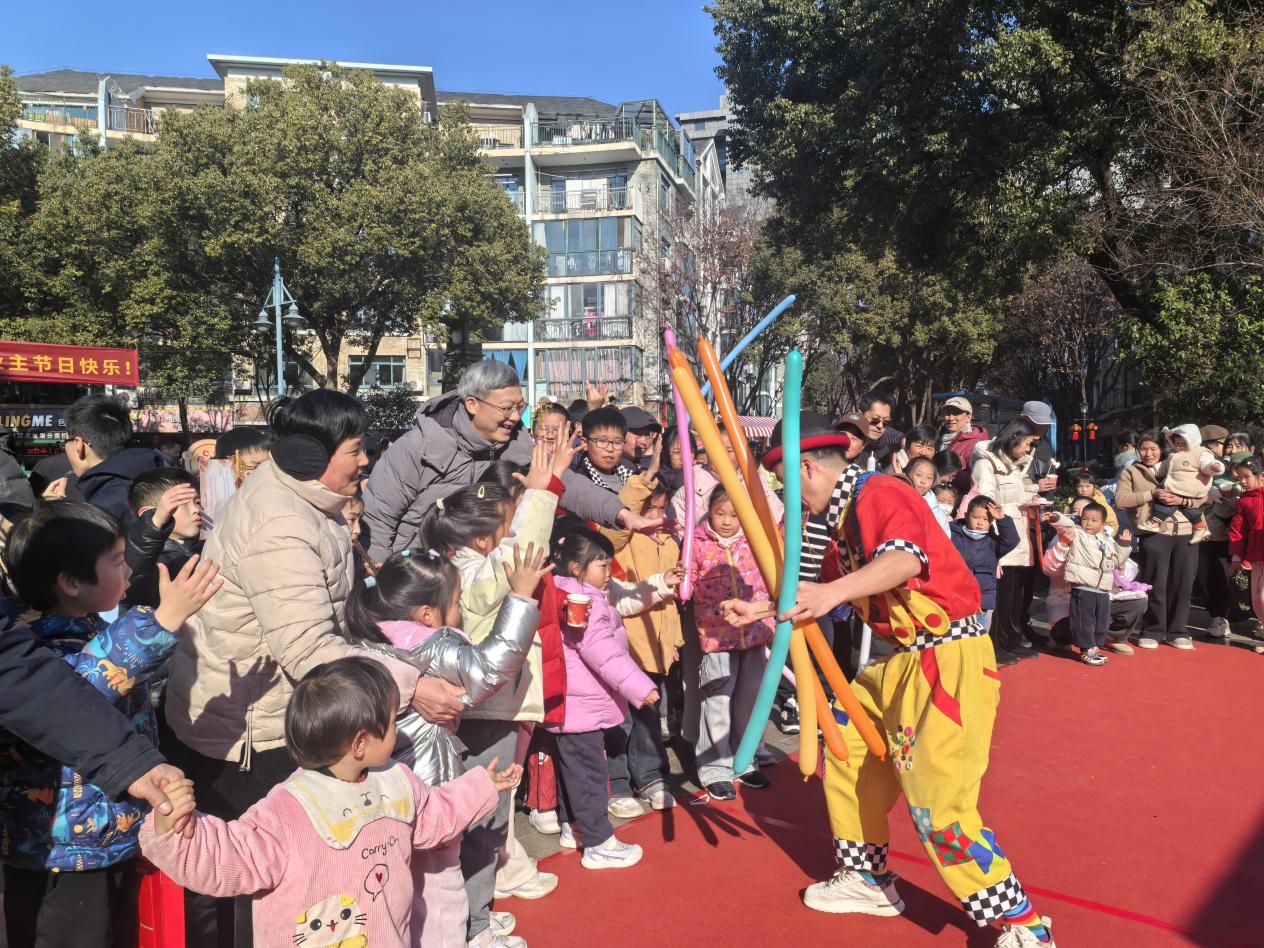 与欢乐市集的沉浸式体验相呼应,中心舞台同样精彩纷呈。韩府社区老年大学学员们带来的舞蹈表演,展现了“老有所乐”的精神风采,也让现场老人倍感亲切;猜灯谜互动,设置了适合老人的传统谜题和适配孩子的趣味谜题,让传统智慧在老少问答间流淌传承;伞舞表演的柔美贴合老人的审美,小丑节目的欢乐则引得孩子们欢呼雀跃,一柔一乐相互映衬,营造出浓厚又贴心的节日氛围。